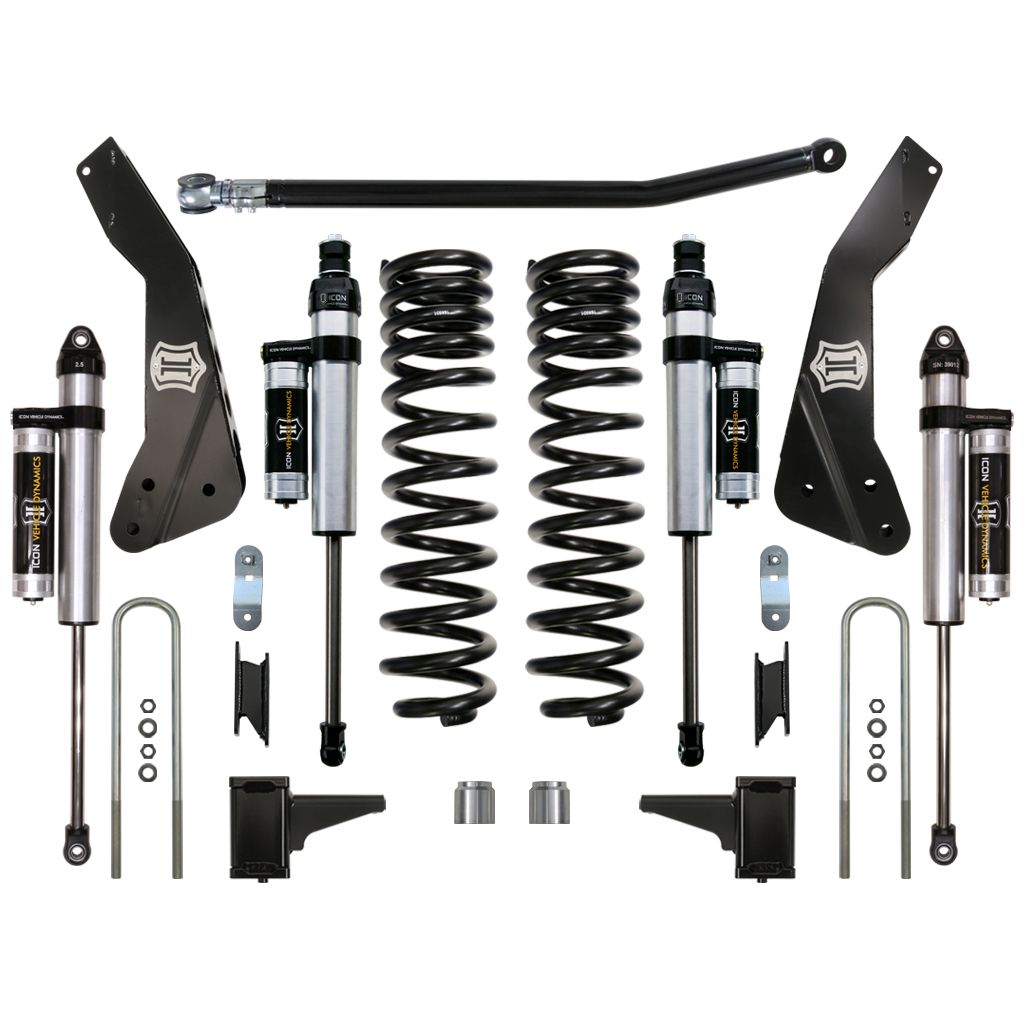 This 4.5" System for the 2011-2016 Super Duty is one of the best riding suspension systems ICON has ever developed. This system has been engineered using the highest quality materials and components. The dual rate front coil springs combined with our ICON 2.5 Aluminum Series shocks give these trucks the performance they so desperately need. This system comes complete with front coils, shocks, radius arm drop down brackets, rear blocks, U-bolts, and our patented adjustable track bar with upgraded bearing giving the front end of these trucks perfect track alignment. The Stage 3 system also upgrades the front and rear shocks to our 2.5" Aluminum Series piggyback reservoir shocks for even better ride quality and performance.