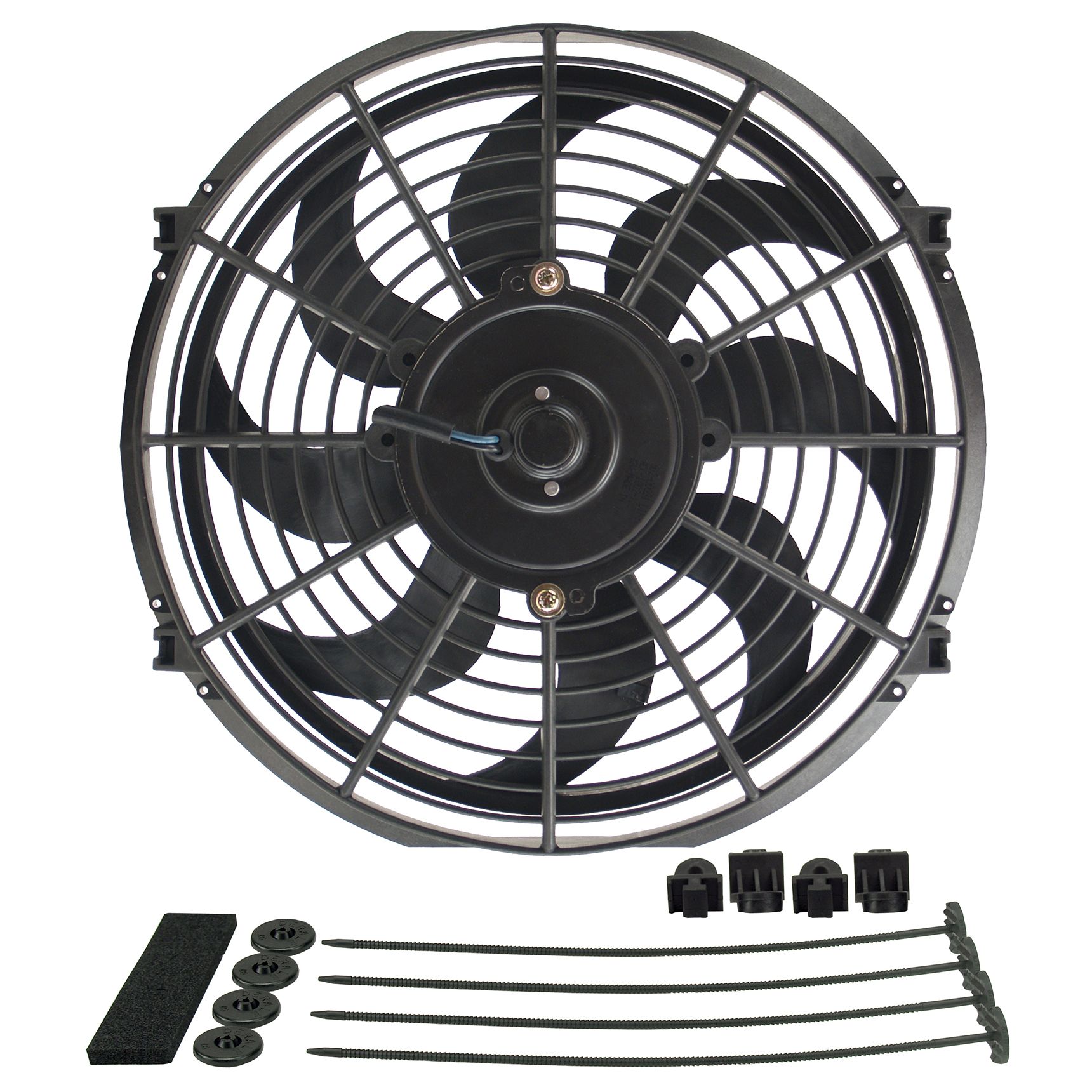 Our Dyno-Cool 12" curved blade electric fan moves 810 CFM at 0 static pressure, drawing only 8.3 amps. Included with every fan is a mounting kit consisting of 4 plastic through radiator core rods and clips, 4 foam pads and 4 mounting feet.