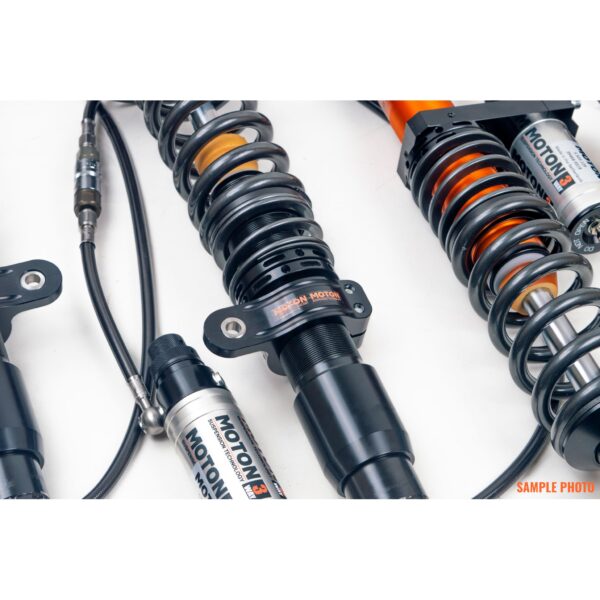 The MOTON 3-way suspension is designed for the dedicated motorsport racers who prioritize optimizing their car’s performance to the highest level. MOTON 3-WAY SUSPENSION is primarily engineered in a race set-up for motorsport, exceptionally well-suited for endurance racing. MOTON has an elevated top guide with a helper piston to reduce friction, resulting in reduced internal wear within this suspension. Ensuring stable and consistent damping performance. Challenge your vehicle by adjusting the rebound and the low- and highspeed compression adjustment separately with a remote reservoir. Each adjustment position provides distinct feedback, delivering a unique driving sensation. The inverted strut design is engineered to handle heavy side loads and braking forces. Both the front and rear dampers in this kit feature a MONOTUBE coilover design. You have the flexibility to adjust spring rates on these dampers. With this suspension you have the capability to fine-tune and customize three critical aspects of your vehicle’s suspension. You can adjust the rebound, means you can control the return to extension of your dampers. With 15 distinct positions to choose from, each adjustment delivers distinct feedback and a unique driving experience. Besides that you can adjust the compression adjustment of this suspension. It allows you to control how quickly the suspension compresses (moves inwards) when the vehicle encounters changing circumstances on the road or track. With this kit you can adjust low- and high speed compression adjustment separately. Low-speed compression refers to the suspension reacts to gentle and gradual compression forces. High-speed compression addresses rapid and forceful impacts. You can stiffen the rebound / compression settings to reduce body roll, improve responsiveness and get better traction with the road. This set of suspension also includes, where applicable, camber-adjustable front Top Mounts and solid rear Top Mounts. Springs are included.