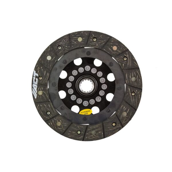 2000802 is a modified rigid-hub street disc featuring premium organic friction materials with high copper content for better heat transfer and steel-backed lining for greater burst strength and durability. These discs are modified with reduced marcel for faster shift action to complement ACT pressure plates. The chrome-moly hub is heat-treated for strength and durability. Rivet design and materials are carefully selected for maximum strength. Lightweight, rigid-hub design allows for quicker shifting and engagement. ACT's street rigid-hub discs provide race-proven performance with street manageability.