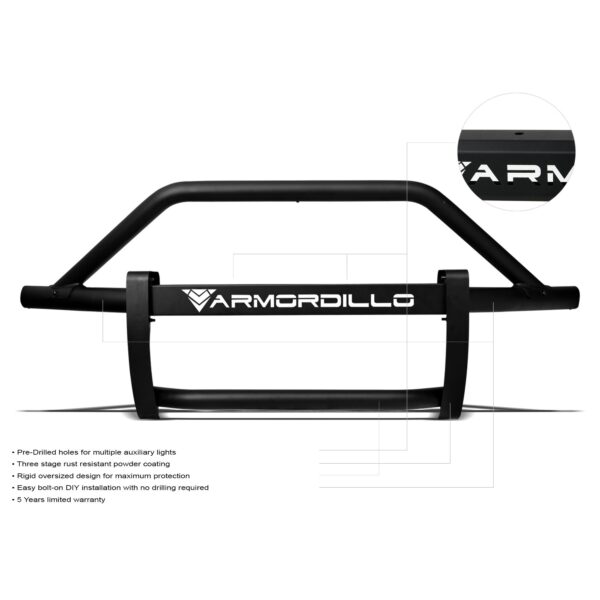 Armordillo AR Pre-Runner Guard is the front-end shield against minor collisions, branches, rocks, and wayward deer. It is composed of a push bar body with 3.5" ID outer tubes to protect your headlight and a cross bar to protect your grille to ensure reliable protection for your front end. It's modular system allows for quick access to your headlights for troubleshooting and maintenance. In addition, the grille guard features AUX light mount holes, making it easy to add a set of auxiliary lights to increase illumination and visibility. The AR Pre-Runner Guard is powder coated to protect from rust and corrosion so you can enjoy the brand-new look of your product for many years to come. Arm your off-road beast with Armordillo, an industry-leading manufacturer of top-of-the-line truck accessories and parts. Years of ingenious engineering and passion for the world's toughest trucks has been poured into providing hardcore off-road products designed to turn your beefy companion into the embodiment of sleekness, edginess, and aggression. The brand offers bull bars, step bars, fender flares, truck bed rails, trailer hitches and some of its unique products. Pre-Runner bumper guards, AR drop steps, lockers, and bull bars. You can count on Armordillo to bring you impeccably strong and durable parts combining brutal appeal with high-end elegance. The brand's bull bars, grilles, fender flares and side step bars are a sure way to instantly give your off-road warrior a more sharp, mean look along with unmatched comfort and protection against the rage of the trails. So, if you are looking to improve your vehicle's stance and fortify its defenses to own the dust with confidence, Armordillo is the answer to all your needs.