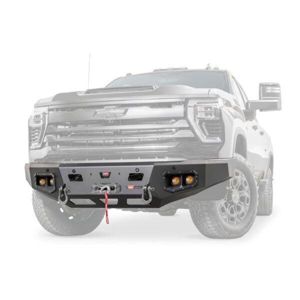 WARN Ascent HD front bumper for Chevrolet Silverado 2500HD and 3500HD featuring a pre-runner style grille guard and integrated winch mount that will accept large or mid-frame winches up to 18,000 lbs in capacity.