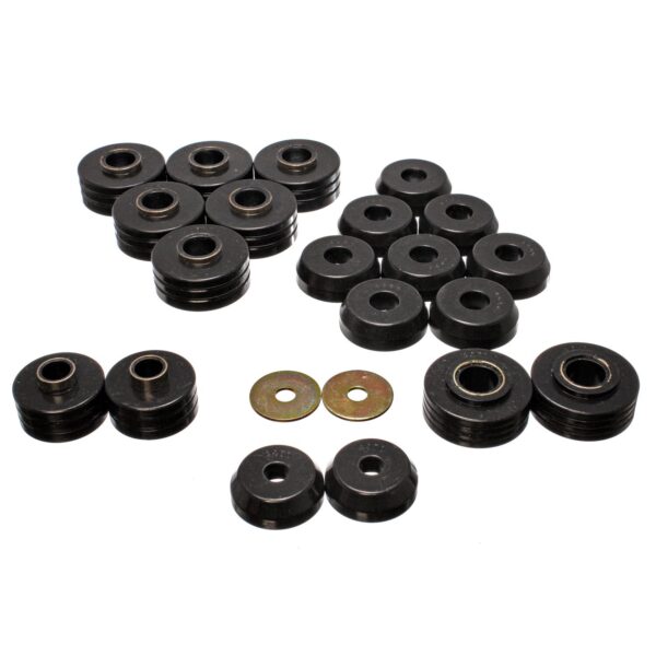 Will replace distorted and worn-out original rubber mounts to maintain car body and truck cab to bed alignment. Original rubber mounts are so soft they often crack, distort, and crush so badly they often fall off. And aluminum body mounts are too harsh for street use that they tend to break and cause other components to break. Energy's specially formulated Hyper-Flex(TM) polyurethane cab and body mounts combine the best qualities of both: they're soft enough for a smooth ride, yet rugged enough for the most demanding road or track. Most sets have a strong zinc plated steel ring molded into them – for added durability and when the application requires it.