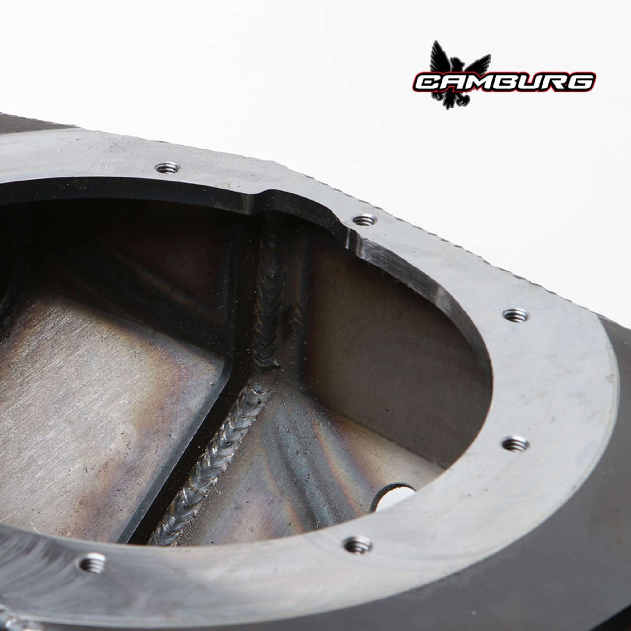 The Camburg 3.50 housing is a high-quality axle housing designed for off-road vehicles. It is built with attention to detail and uses strong materials for durability. The center section is made from high strength low carbon A50 steel plate, with a 3/8" thick faceplate and internal gussets for added strength. The housing is CNC machined for precision and features a 3/16" thick bash plate for rock protection. The axle tubes are made from 3.50" OD x .250w 4130 chromoly tubing, which offers strength and compatibility with various hub combinations. The welding is done in specific fixtures to minimize distortion and ensure straightness. Optional upper 3 and 4 link mounts are available for optimum strength. The axle tubes can be heat-treated for increased strength and surface hardness. The housing is custom-built to your specifications with many options available. It is recommended for lighter weight vehicles, hot rods, and pre-runners running 33-37" tires with lower horsepower engines. The housing features MIG welded construction, a CNC machined seal surface faceplate, a radiused rear truss, and a large filler with an aluminum O-ring cap. It also includes a -8 AN vent fitting and a 3/4" NPT drain plug. The 4-link setup uses 5/8" bolts at the upper mounts and 3/4" bolts at the lower mounts, while the 3-link setup uses 3/4" bolts at both the upper and lower mounts. High mis-alignment spacers are available for both setups.