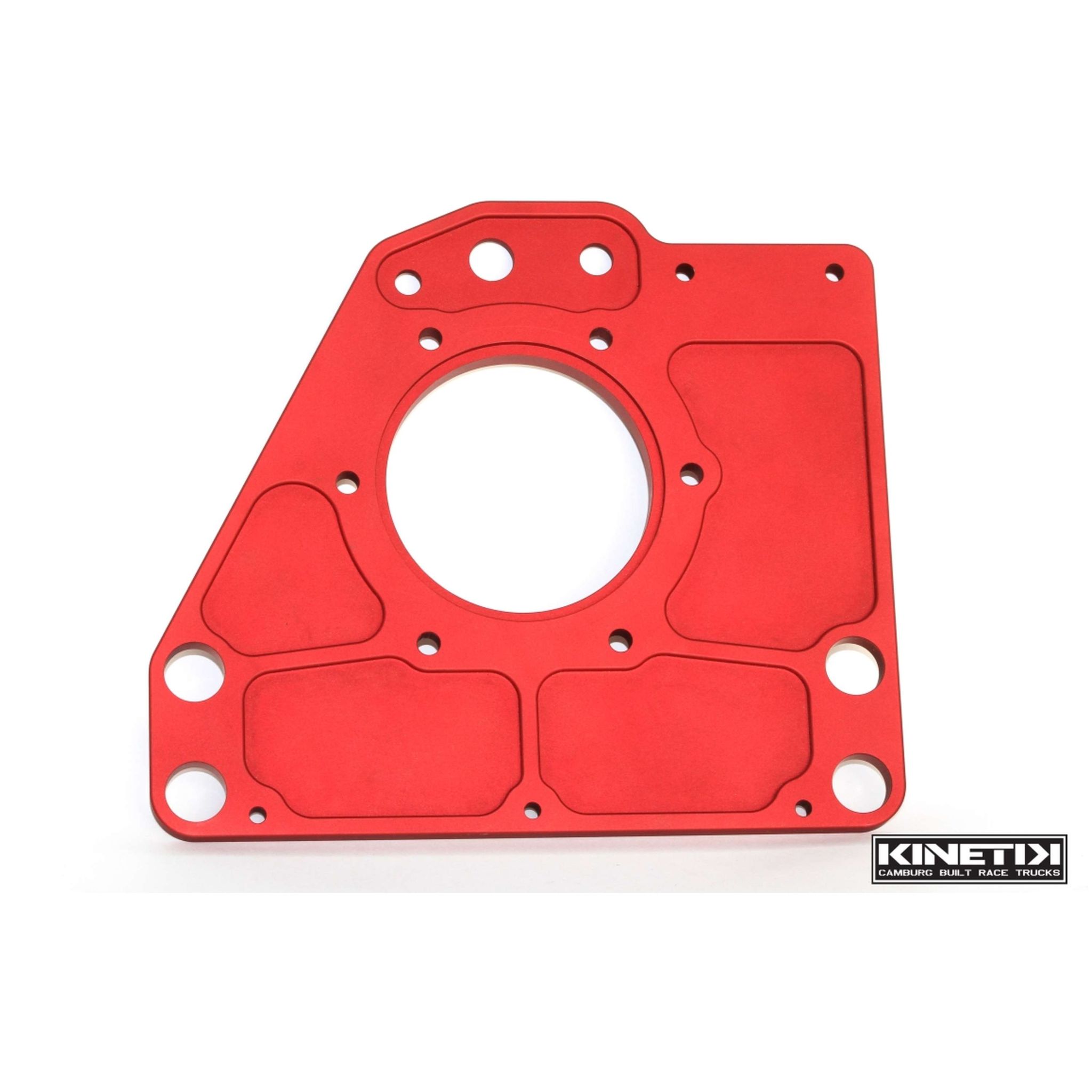 Our Camburg built KINETIK Turbo400 transmission rear chassis mounting plates are machined in-house from aerospace 6061 aluminum, then bead blasted and Type II anodized red. We use these in all our KINETIK 7200/6100/TT chassis' along with our custom builds. We fully machine these with pockets to reduce weight without compromising strength. This is designed to be used with our KINETIK or Culhane rear tail housing assemblies. We incorporated these to mount the remote transmission filter and AN bulkhead fittings.