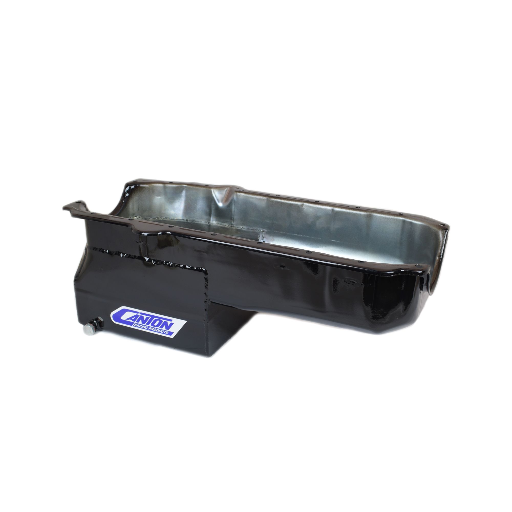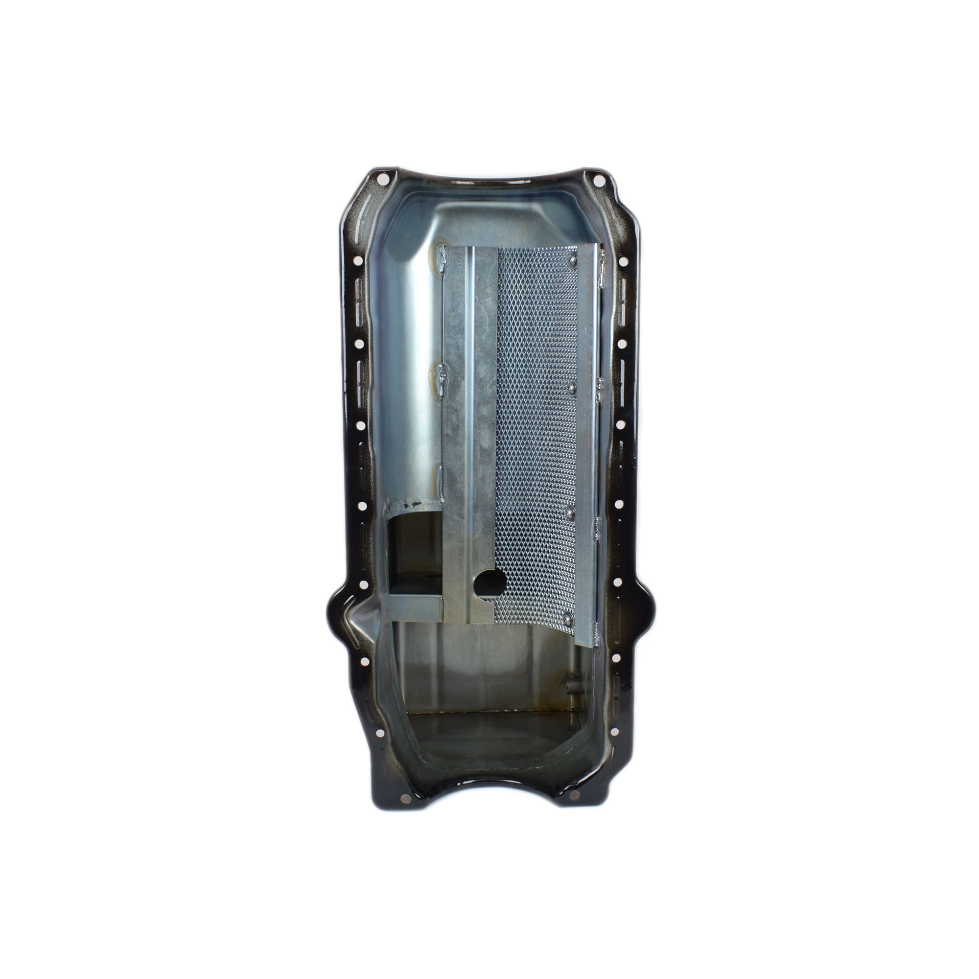 This black powder coat bracket drag race oil pan is for Small Block Chevy pre-?80 blocks with left side dipstick and is designed to fit most stock chassis. It has an 8" deep by 9-1/2" long sump and a 6 qt. system capacity. Clears a 3.875" stroke with a steel rod. Will work with stock or aftermarket starters. This pan requires one of our pickups.