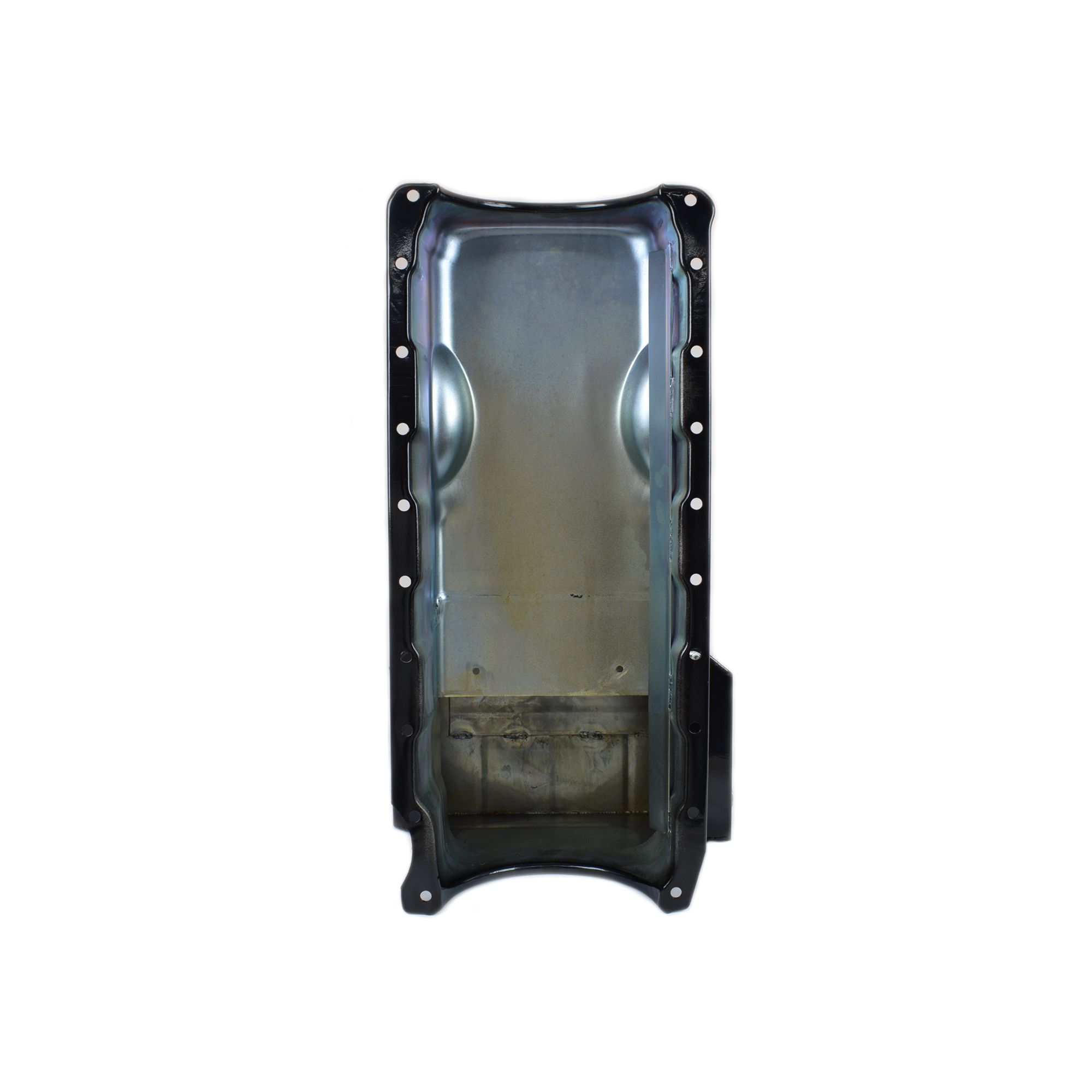 This black powder coat BBC early Chevelle pan is for Mark V and VI Big Block Chevys. It is designed with angled front corners to fit in '64-'67 Chevelle and most other GM chassis. It has a 9" deep, 13" wide, 8-1/2" long sump for an 8 quart system capacity. This pan requires our 20-190 pickup.