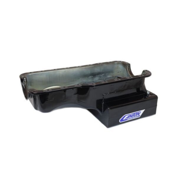 This black powder coated front sump road race pan is for Ford 351 Windsor blocks. It has an 8" deep, 13-1/2" wide front sump with a 9 qt. system capacity. Will work with stock & aftermarket starters. This pan requires our 15-661 pickup.