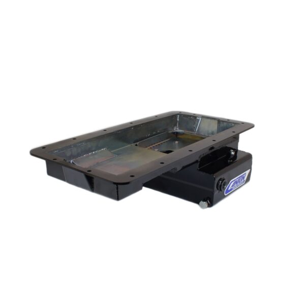 Cantons new black powder coat 15-738 Ford 5.0 Coyote oil pan is designed for early Ford chassis and others that required a front sump oil pan. The pan is designed with a ?t?sump for extra capacity and is used in road race applications where ground clearance is important .It features a diamond shaped road race baffle assembly with four trap doors and a removable Windage/anti-slosh baffle.