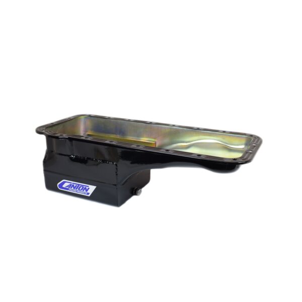 This black powder coat Ford 332 – 428FE deep front sump oil pans provides extra capacity but retains stock width to clear competition headers. It has a 7-1/2" deep sump for a 7 quart system capacity. This pan requires our 15-851 pickup.