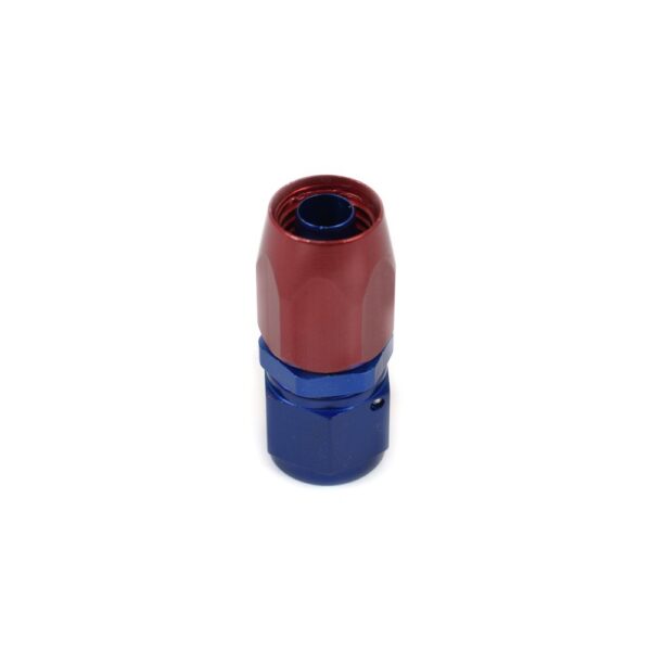 This aluminum swivel straight hose end fits -8 hose onto 37 deg. female -8 AN fittings. It is for use with our stainless steel braided hose. It features one piece billet tube construction, viton o-rings, and blue and red coloring.