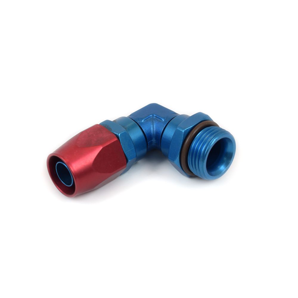 This aluminum swivel 90 deg. hose end fits -10 hose into female -12 AN O-ring ports. It is for use with our stainless steel braided hose. It features one piece billet tube construction, viton o-rings, and blue and red coloring.