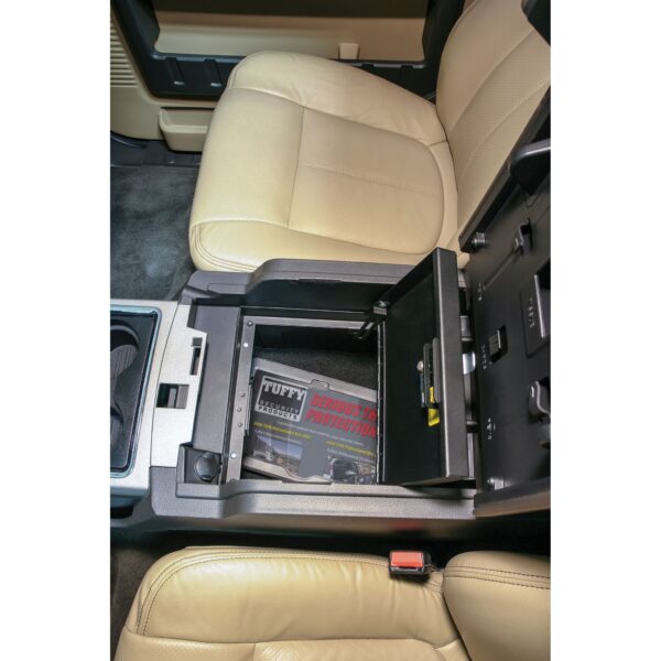 Continuing the Tuffy legacy of designing and manufacturing the finest console safes in the industry since 1997, Tuffy is proud to introduce our new security console safe for the Ford Super Duty 2011-2016 with a flow-through center console. It maintains a completely stock look including full use of the factory accessory tray, armrest and lid. Featuring a durable texture powder coat finish, the safe comes ready to install in just a few minutes without drilling. Patent pending.
