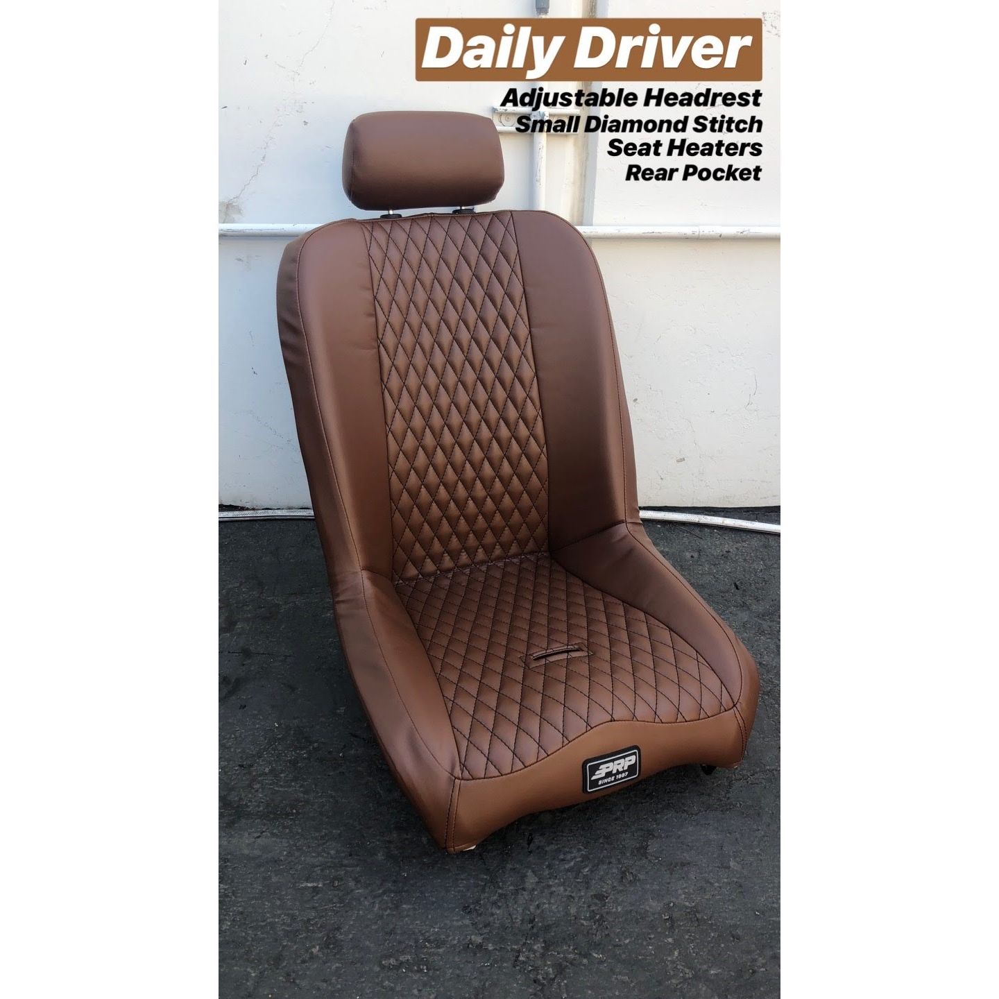 While having a lot of containment in off-road racing seats is nice when you’re actually off-road, it really gets old if you take your rig to work everyday or just drive it a few times a week. The Daily Driver Suspension Seat has 5” of containment which will hold you in on the trail but still make it easy to climb in and out of your Jeep or truck. The vinyl-coated nylon suspension liner and dual-density foam decrease the impact on the body, reducing the fatigue you feel after a long day in the dirt or dunes. Customize your seat with over 60 fabric and color options as well as features like heaters, lumbar support, and storage pockets. The bottom tabs easily bolt to PRP’s series of mounts built for Jeep, Broncos, Toyota Tacomas, Ford Rangers, and more. Like all of PRP’s Classic Series seats, the Daily Driver can be built up to 4” taller and 2” wider (Be sure to measure your vehicle to see if you have enough room). As an alternative to the height options, you can change the classic hoop to an adjustable headrest or eliminate the headrest altogether for that vintage low back look. NOTE: Extra wide seats will not fit in Jeep models unless you have made significant changes to the interior. Please review your measurements closely.