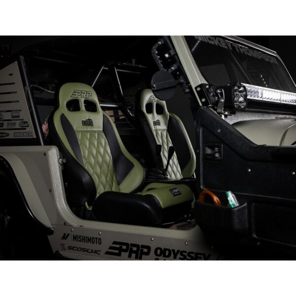 Add comfort and containment to your Jeep, Truck, or Buggy with the EnduroCrawl Reclining Suspension Seat from the Enduro Elite Series, the newest line of Reclining Suspension Seats from PRP. Featuring updated styling and a dual slot headrest for harnesses, the EnduroCrawl is designed to replace stock seats in a Jeep Wrangler, Jeep XJ, Ford Ranger, Trucks, or Buggy for a significant improvement to your enjoyment, comfort, and containment off-road. Featuring medium bolsters on the bottom and back of the seat, the EnduroCrawl provides the most containment for serious off-roading while retaining the ability to recline the seat. The bottom features higher sides to keep your legs locked in when bouncing around and the back lower section features a medium bolster at your sides that help to keep you secure. While the wider top section opens up, making it more comfortable for larger riders or those with broad shoulders. A removable, dual-layered seat cushion means the EnduroCrawl offers better leg support and extended comfort. The vinyl-coated nylon suspension liner and dual-density foam decrease the impact on the body and reduce body fatigue after a long day in the dirt or dunes. EnduoCrawl Reclining Suspension Seat is great for serious off-roaders who want to be held tight on the trails, with the additional comfort and adjustability of a reclining suspension seat. The EnduroCrawl reclines completely and inclines forward enough for access to the rear seats. The bottom tabs easily bolt to PRP’s series of mounts for Jeeps, Broncos, Ford Rangers, and more. The seat features Suede Center, Vinyl Back and Vinyl Bands.