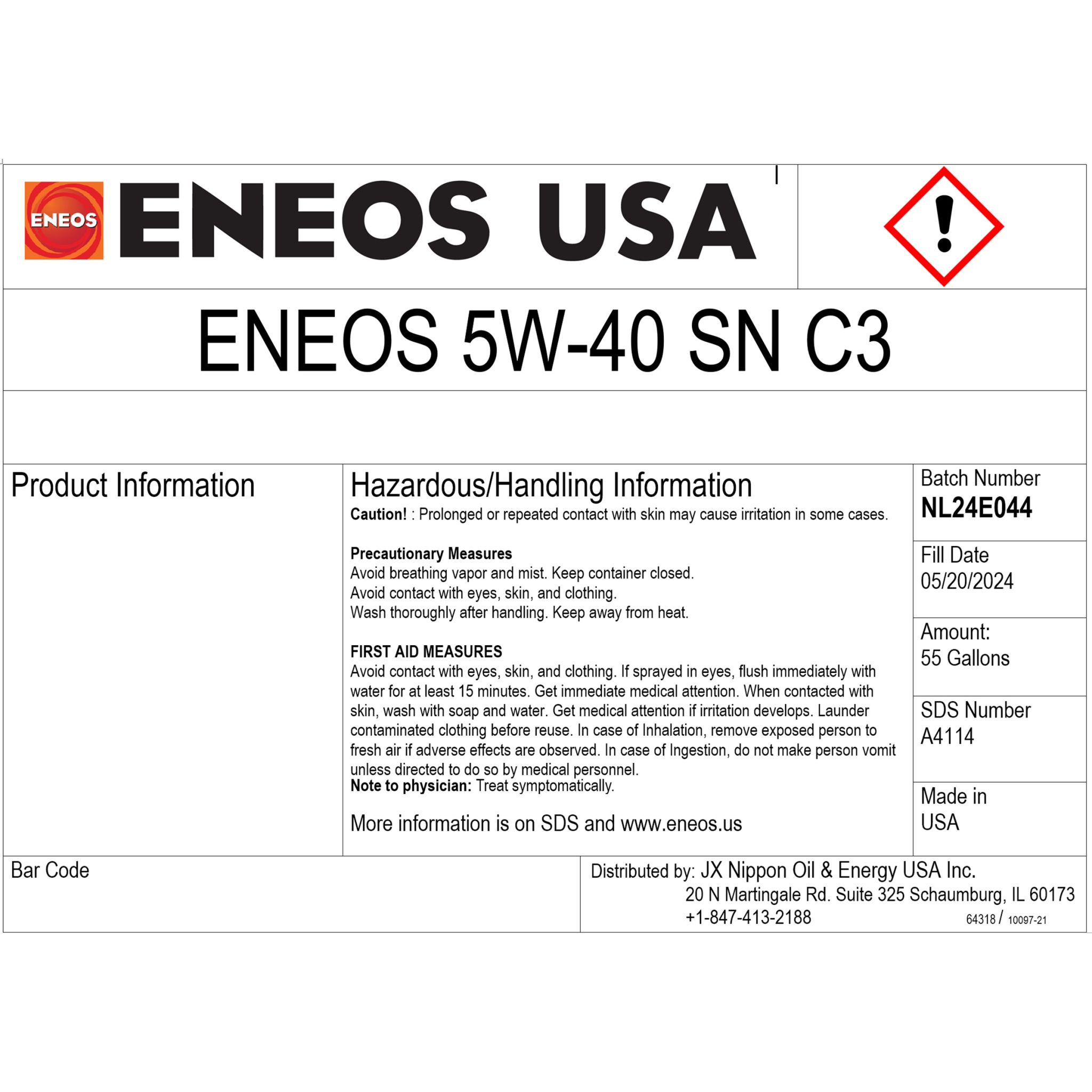 ENEOS 5W-40 Fully Synthetic Motor Oil is 100% fully synthetic motor oil formulated with high-quality base oils and an optimized additive blend. It is ideal for both fuel-injection and diesel engines. Meets API SN/CF standard, and the European Automobile Manufacturer's Association (ACEA) C3, making it especially suitable for European cars. ENEOS 5W-40 is for automobiles with factory recommended viscosity of 5W-40. It is a high-performance engine oil used in gasoline and diesel engines that meets the American Petroleum Institute (API) standard SN/CF. ENEOS 5W-40 meets the European Automobile Manufacturers Association ACEA C3, as well as MB229.31 & 229.51, VW 50500 / 50501, BMW LL-04, and Porsche A40.