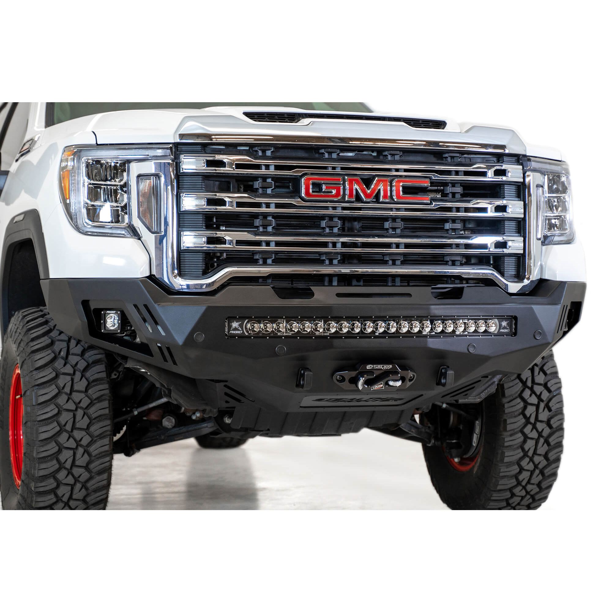 Addictive Desert Designs has done it again! Stealth Fighter Bumpers are now available for all GMC 2500/3500 models. With precision engineering, our radius steel plate design contours perfectly to the front end of your truck. A universal light mount, centered on the bumper, provides space for up to 10 cube lights or a 40" radius light bar. Standard cutouts allow OEM parking sensors to be fully-retained and side panels come with an additional cube light. For added strength, Stealth Fighter's bolt directly to the truck's frame with a standard winch mount. Functionality and durability are maximized with access holes at the top of the bumper. Clevis mounts provide added reinforcement with a mounting point for 3/4" D-rings. Always bolt-on, always made in America.
