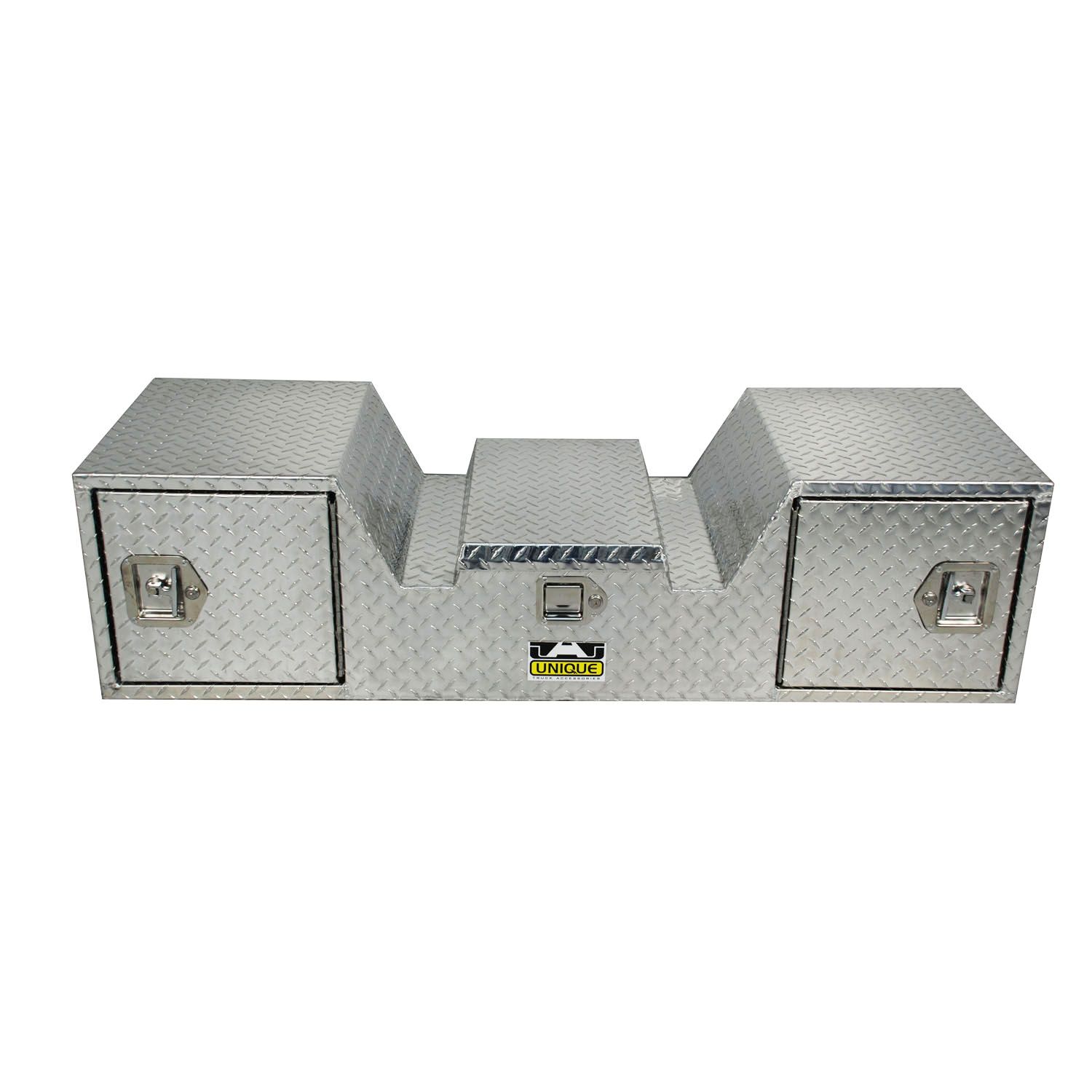 57" V-Shape 5th Wheel RV Box, 1 Lid, 2 Rear Facing Doors; 1 Center Compartment with Lid/Shock; 2 Outer Door Compartments; Easier Access when Hooked up; Locking Paddle and Folding T Handles; Rubber Seal; Black Texture Coated