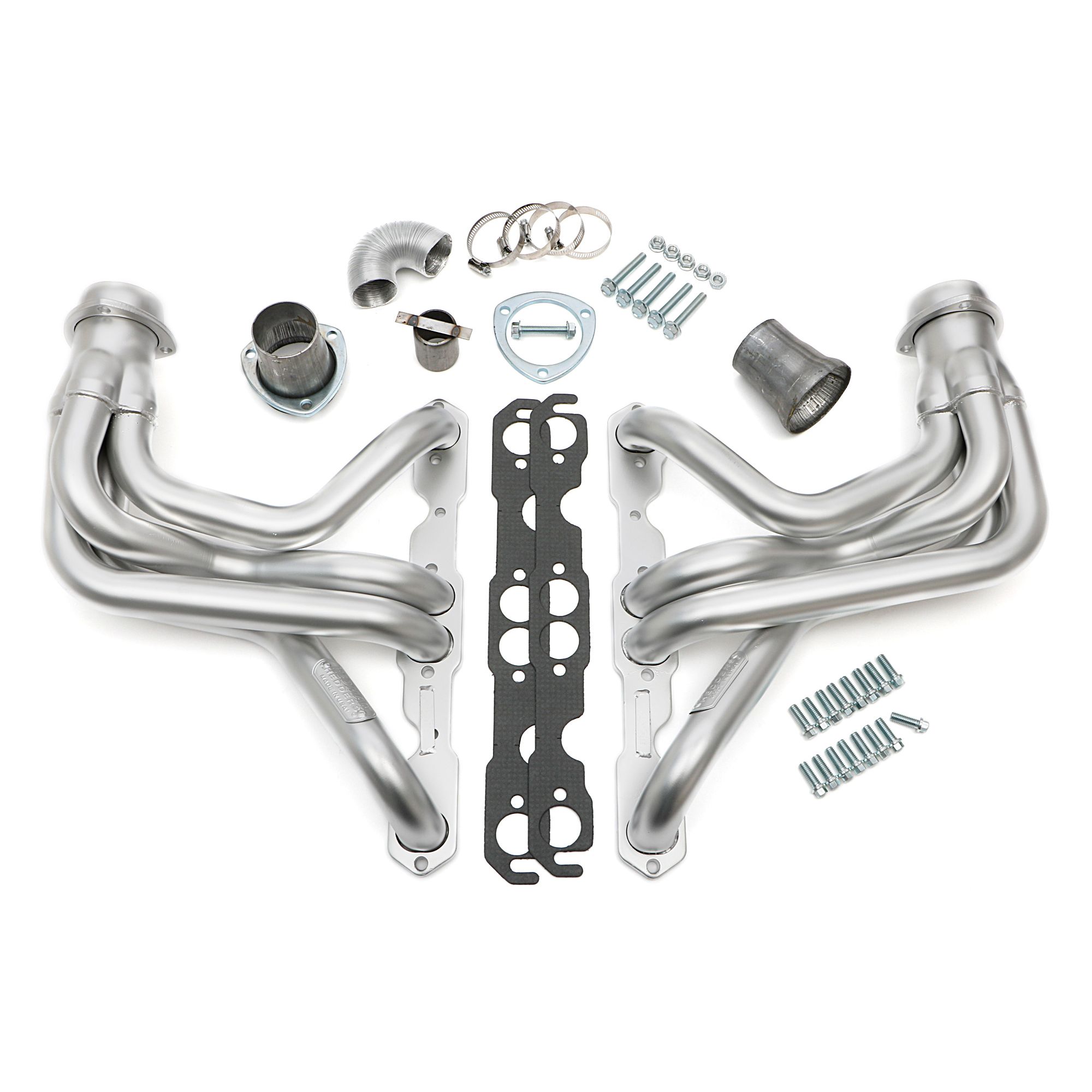 Heavy-Duty ELITE, Long Tube, 50-State Headers For 1967-87 CHEVY/GMC 4WD (only) 1/2 to 3/4 Ton Pick-Up Truck, Blazer, SUV; 283-400 SB Chevy Without A.I.R. (Centered Engine Chassis Only); 1-5/8 in. Tubes; 3 in. Ball/Socket Collector