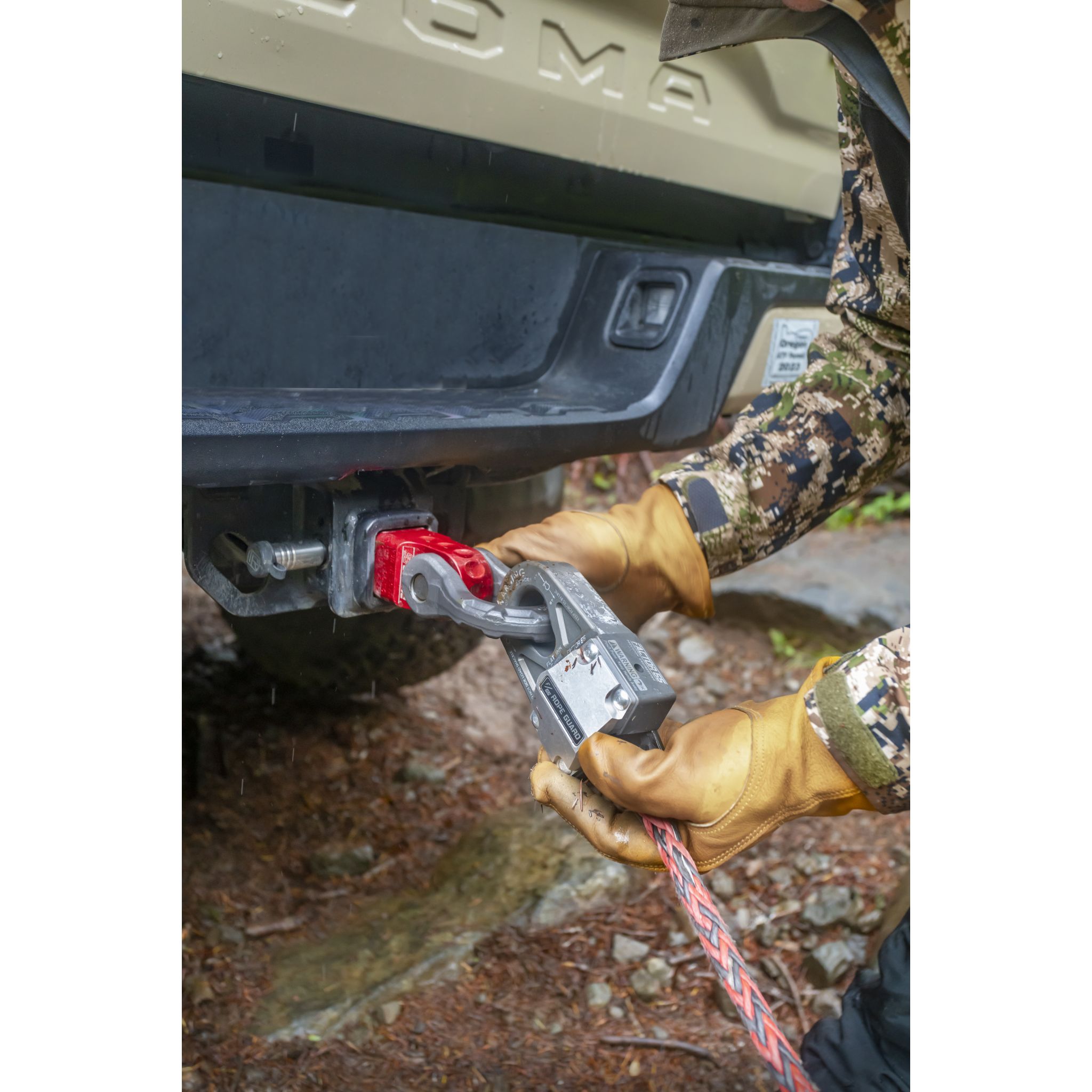 Made from lightweight, super-strong CNC-machined 6000 series aluminum, the HitchLink 2.0 allows you to utilize your vehicle?s 2-inch receiver as a recovery/tow point. Simply slide this shackle mount into the receiver?s opening and secure with a hitch pin (not included). Accommodates a common 3/4? screw pin shackle as well as soft shackles up to 1/2?. Rated at 9,500 lbs. Anodized or powder coated depending on the finish.