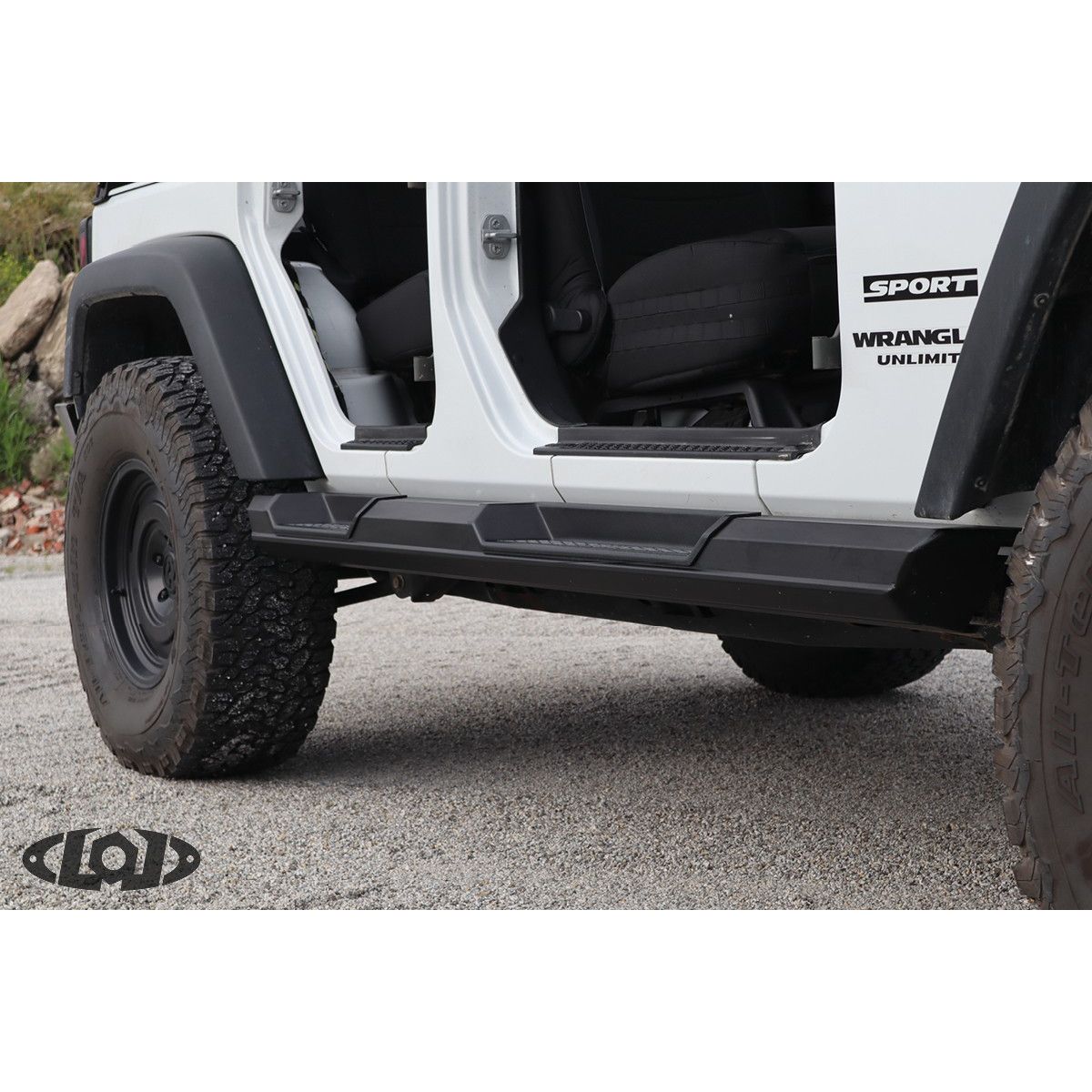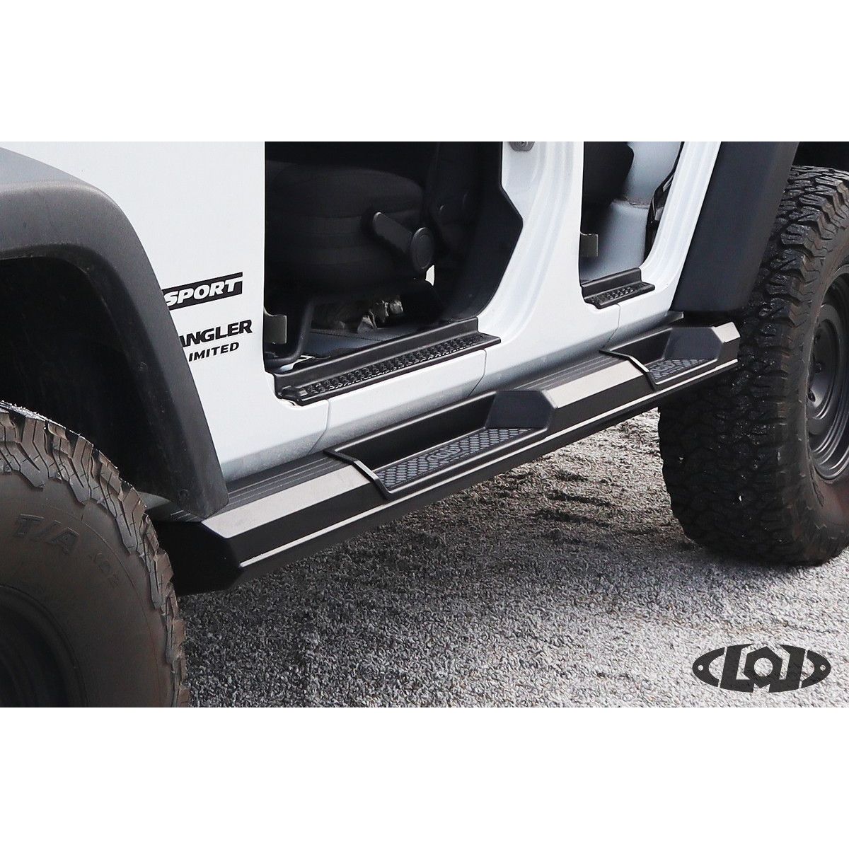 2007-2017 Jeep JK Wrangler Armor Lite Rocksliders Innovative One Piece Extruded Aluminum body construction for MAXIMUM strength! Configurable and modular design allows the addition of individual drop steps or larger one piece drop steps for easy entry and exit from your Jeep. Drop steps are easily removable within seconds without the use of any tools, so when you get to your destination, you can remove the drop steps and hit the trail and use your sliders for their intended purpose of protecting your Jeep! Optional high strength steel bolt on skid plate allows you to protect the aluminum sliders from rock rash while allowing the sliders to easily slide over obstacles! Easy install !! 3 piece High Strength Steel Frame mounted Design requires NO Drilling to install !