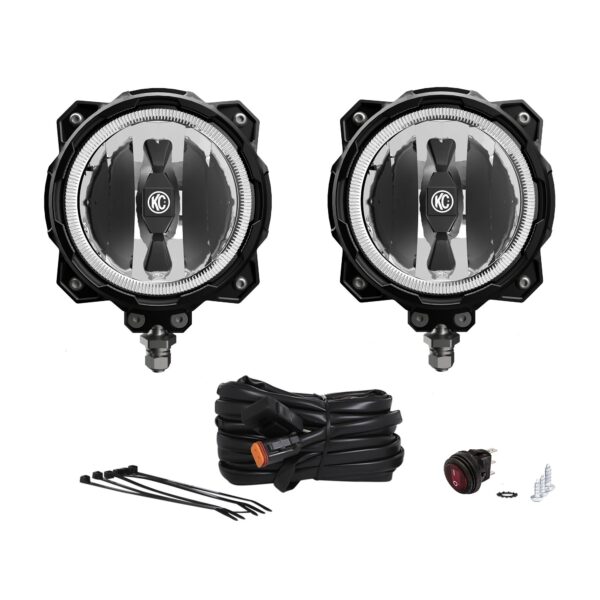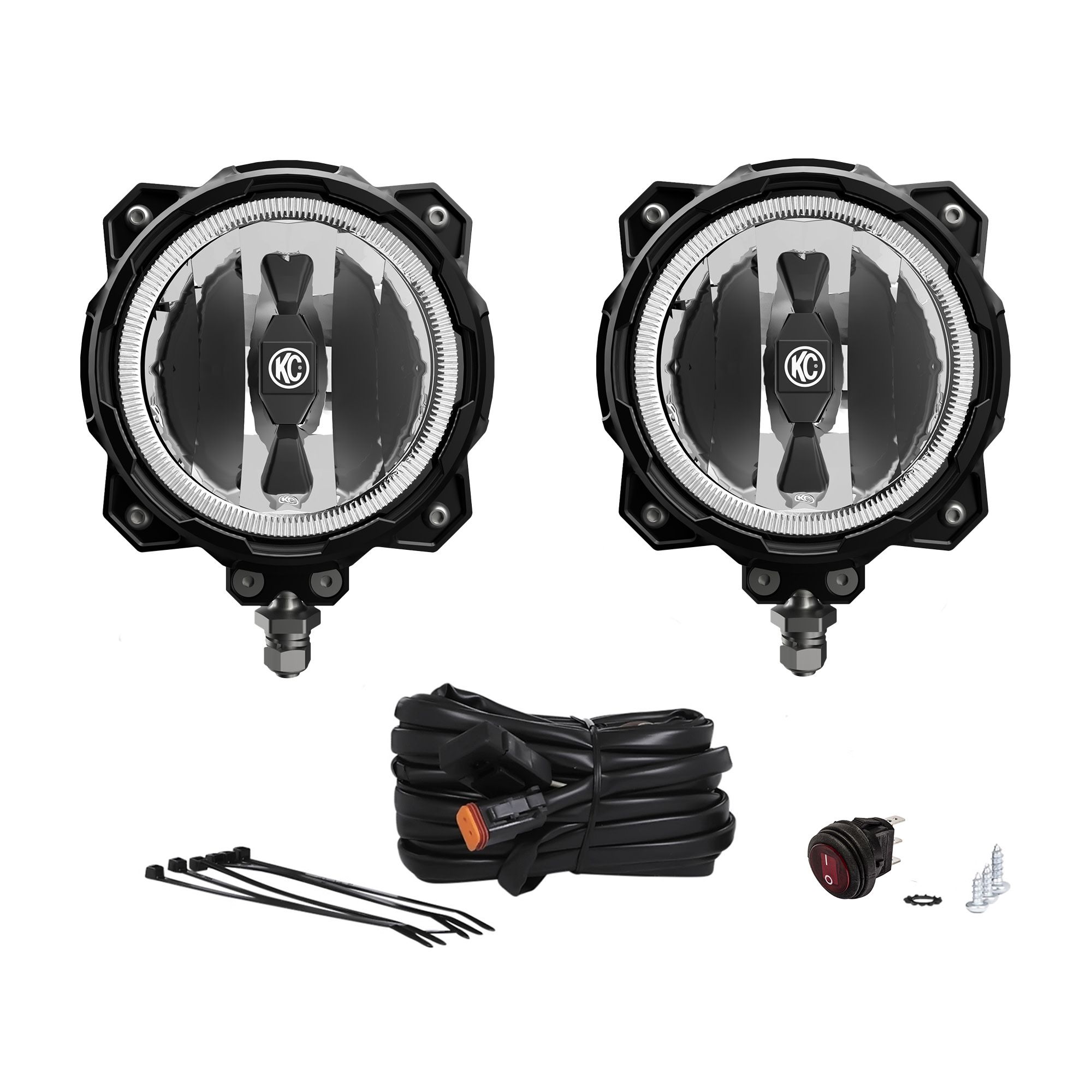 Parts Included: (2) Gravity LED Pro6 Single Lights, (2) Light Covers Black with Yellow KC Logo, Mounting Hardware, Performance Wiring Harness w/ 2Pin Waterproof Connectors and Illuminated LED Light Switch