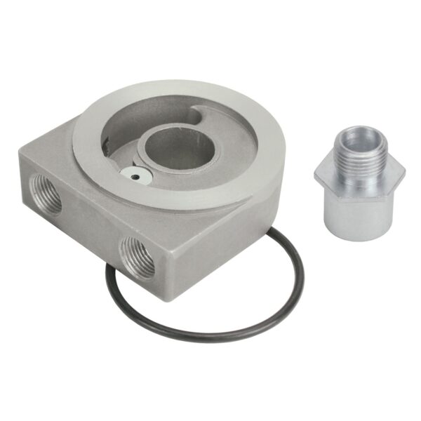 This new high quality low profile aluminum sandwich adapter measures only 1" thick and features 3/8" NPT ports, and a pressure relief valve. Providing the ability to add external oil lines for run an engine oil cooler, this adapter lowers the factory oil filter only 1" below the stock location. Designed to be used on engines with a 22mm x 1.5 filter thread.
