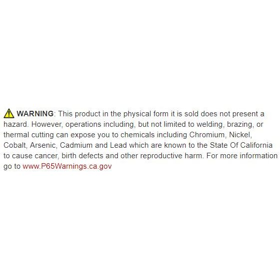 Prop 65 – Long Label: WARNING: This product in the physical form it is sold does not present a hazard. However, operations including, but not limited to welding, brazing, or thermal cutting can expose you to chemicals including Chromium, Nickel, Cobalt, Arsenic, Cadmium and Lead which are known to the State Of California to cause cancer, birth defects and other reproductive harm. For more information go towww.P65Warnings.ca.gov