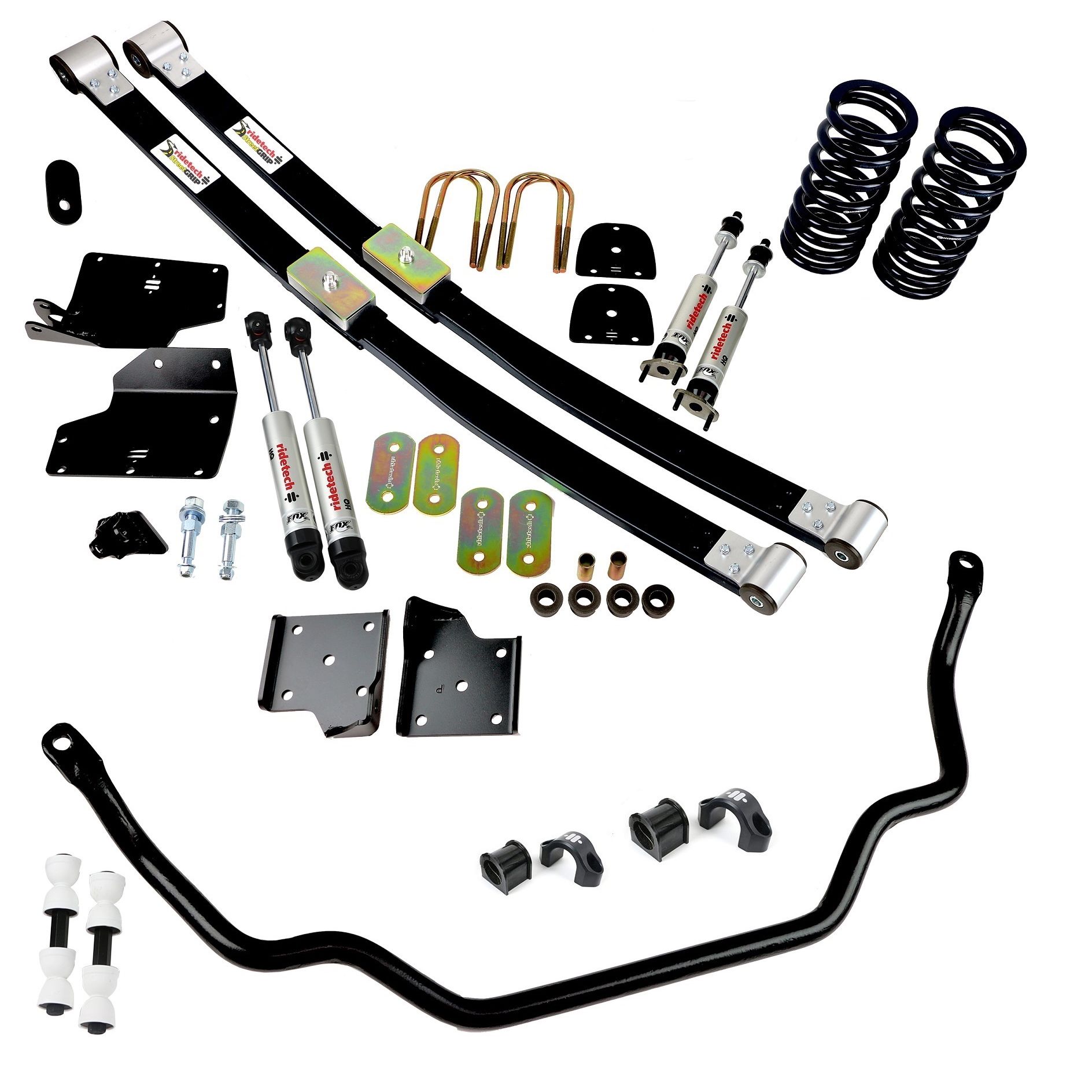 StreetGrip suspension system for 1967-1970 Mustang with big block, without front arm bushings, shafts and bj plates. Includes front dual rate coil springs, rear composite leafs, delrin leaf spring bushings, front sway bar and HQ shocks.