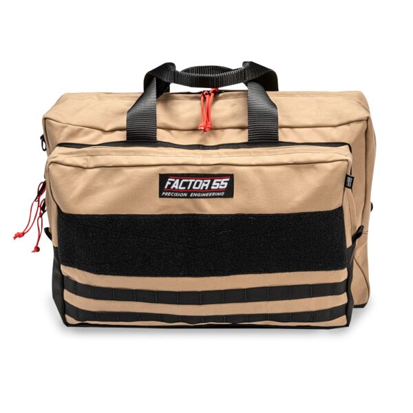 No vehicle recovery is the same. Some recoveries are simple, while others are more complicated. The Ultimate Recovery Bag has been custom designed to hold Factor 55 recovery equipment in one accessible place. The interior is large enough to easily contain our 30' x 7/8" Kinetic Energy Rope, 8' Tree Saver, Shorty Strap II, and Shorty Strap III. In addition, the bag features two large outside zipper compartments, each large enough to hold our 30' x 2" Extreme Duty Tow Strap and other accessories. Seven interior stash pockets hold shackles, pulleys, gloves, Fast Fid, etc. The bag also retains space for winch line extensions and multiple other pieces of rigging. Large Velcro strips are featured on both sides of the bag for placement of Velcro-backed patches. The bottom of the bag is reinforced with 1500 denier ballistic Cordura. The 2-inch MILSPEC riggers? webbing completely wraps around the bottom of the bag adding an additional layer of strength and support. Heavy Duty powder coated steel rings are stitched on both sides to attach a wide variety of shoulder straps (not included). Featuring Heavy Duty YKK Zippers, each knotted with 550 Paracord, offer a longer gripping surface for ease of opening and closing the bag. Once the bag is unzipped it retains its large shape allowing easy access to all interior components. The interior is reinforced Cordura and edged with binding tape. The 1000 denier blaze orange interior Cordura is perfect for readily finding all components of your recovery gear, even in low-light conditions. Once packed, the bag retains a rectangular shape for easy storage and will nest neatly with your other gear. A bag built to last a lifetime. Made in the USA.