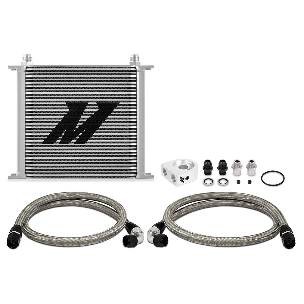 Proper oil temperature regulation is key to extending and preserving the life of your stock or high performance engine. Keep your temperatures in check with the Mishimoto universal oil cooler kit. This kit is applicable for most vehicles and includes all key components for reducing oil temperatures and providing your engine with extra protection against oil degradation. This kit includes a billet anodized aluminum sandwich plate in either standard or thermostatic form. The optional Mishimoto thermostatic sandwich plate provides additional temperature control and will limit oil flow to the cooler until optimal temperatures are reached, making it ideal for those in cooler climates. The included core is our proven Mishimoto 34 row stacked plate cooler which can withstand high fluid pressures and significantly reduce oil temperatures while exhibiting minimal pressure loss. This kit includes both a -16 and M20-1.5 sandwich plate adapter which supports fitment for most makes and models. This kit also includes pre-assembled stainless steel braided oil lines with -10AN fittings and dowty seals for durable, leak free connections. Whether you are piloting a boosted rotary or blown small block the Mishimoto universal oil cooler kit will provide the efficiency you need to stay on the track and out of the shop. As with all our products this kit includes the Mishimoto Lifetime Warranty. Please note: Mishimoto fully inspects and cleans all products prior to packaging. However, it is recommended that customers flush the oil cooler with one quart of clean oil prior to installation to remove any debris accumulated during shipping. Please feel free to contact us at support@mishimoto.com if you have any questions.