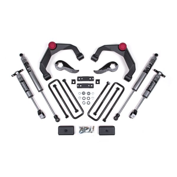 Along with the arms, a pair of reindexed cast steel torsion bar keys are supplied up front to lift vehicle. Zone Offroad includes a small differential relocation kit (4WD models only) to correct CV axle operating angles without effecting ground clearance. The sway bar operating angle is corrected with the use of a pair of relocation brackets allowing for full droop of the suspension and proper clearance. In the rear a 2? block and u-bolt kit is used to create a level to slightly tail high stance. Rounding out the kit are a set of Nitro gas or FOX adventure series IFP gas shocks at all 4 corners for a smooth ride and impressive performance across any terrain. Take your late model GM 2500HD to the next level with Zone Offroad!