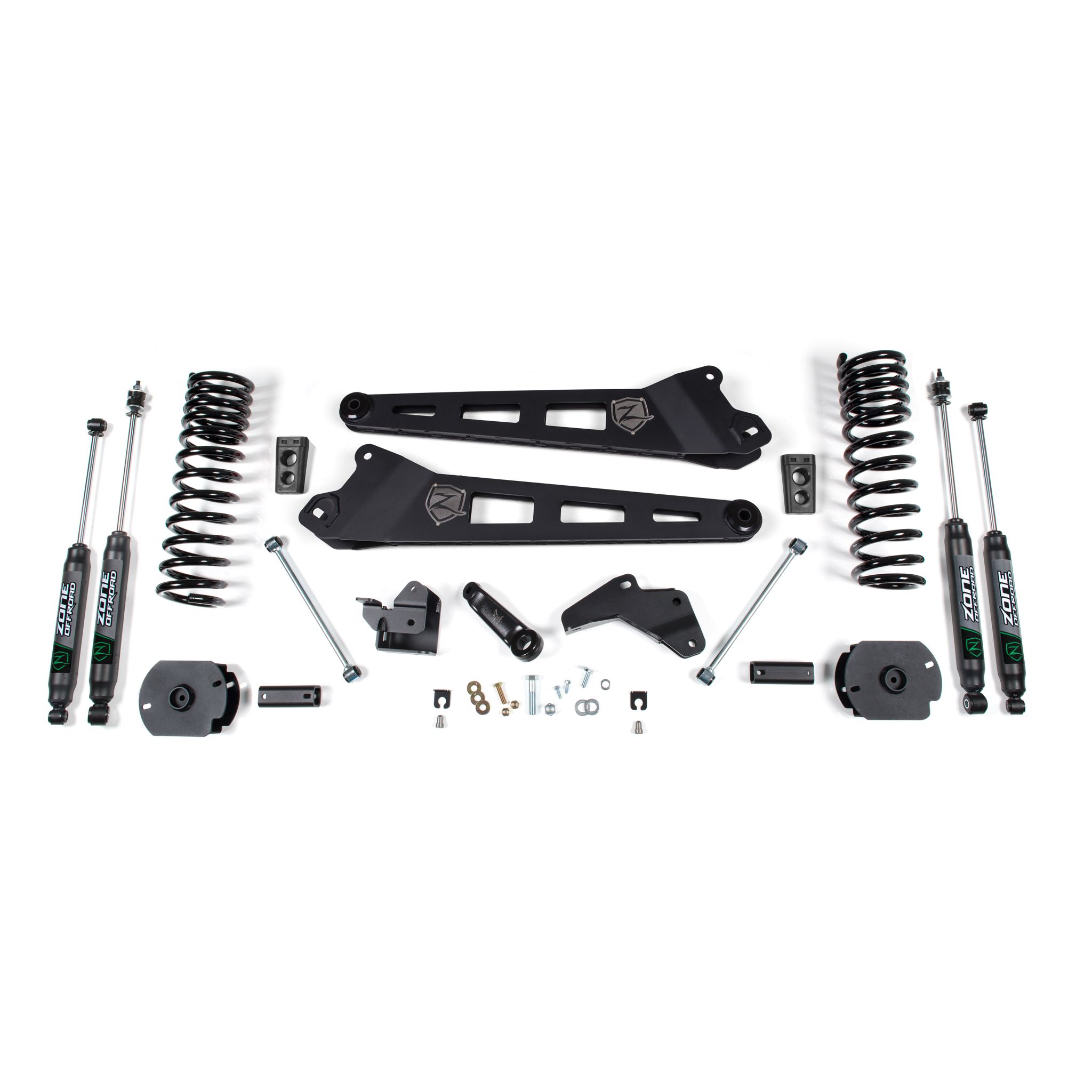 Take your RAM 2500 to new heights with this 4.5" lift kit from Zone Offroad. Kits include everything needed from full length coil springs and stout radius arms to steering correction and rear lift to level the stance. Get the look, performance, and capability your truck deserves with clearance for up to 37" tires.